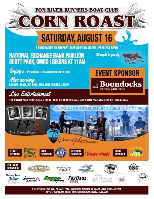 Join us on Saturday, August 16 2025 for the annual Fox River Runners Boat Club’s Celebrate the Fox Corn Roast fundraiser at Scott Park in downtown Omro, WI starting at 11 am. Come early, stay late. Enjoy a day on the Fox River.